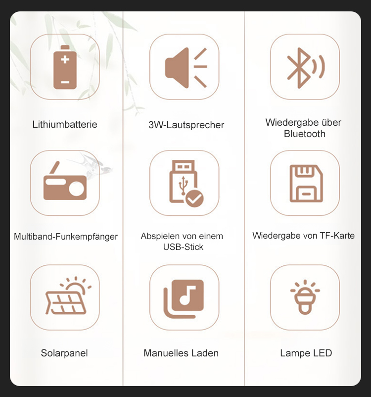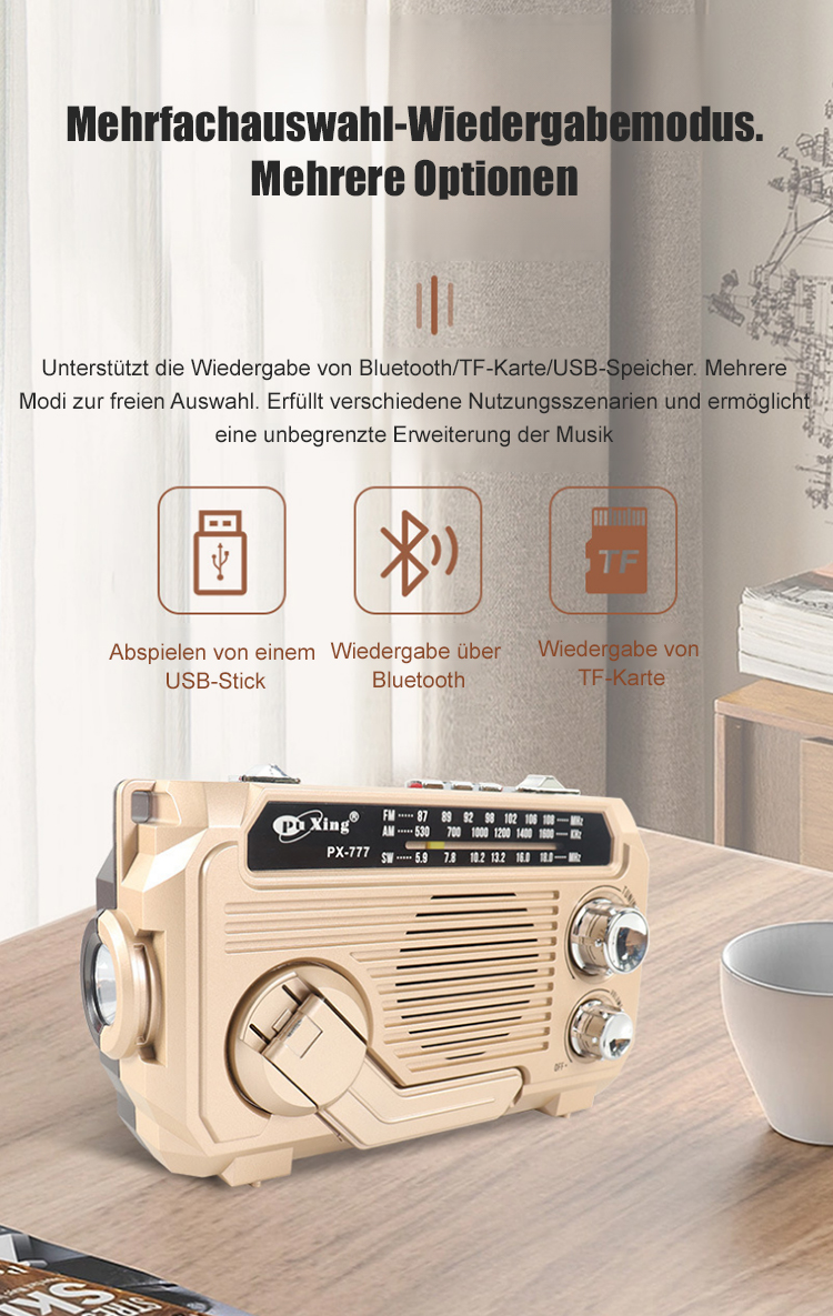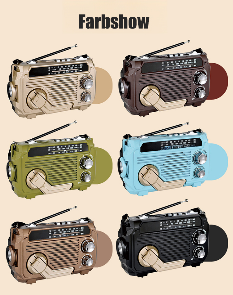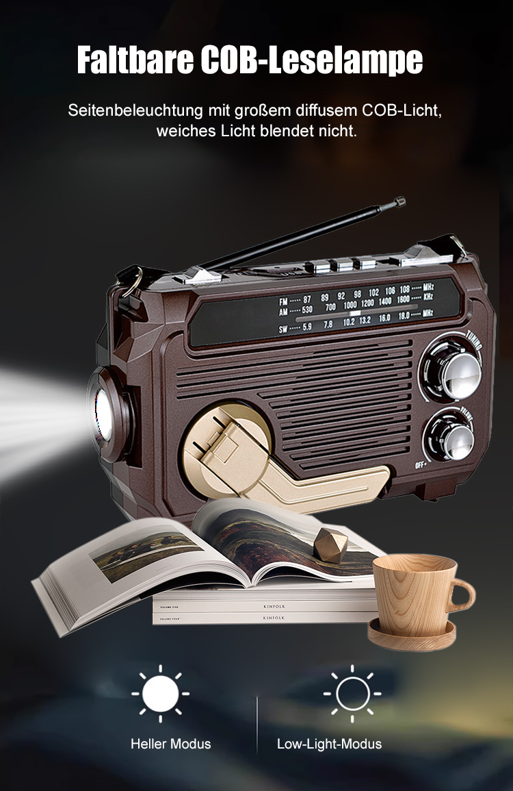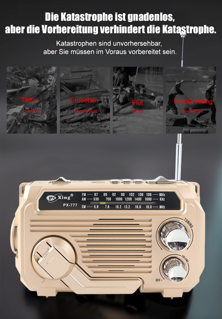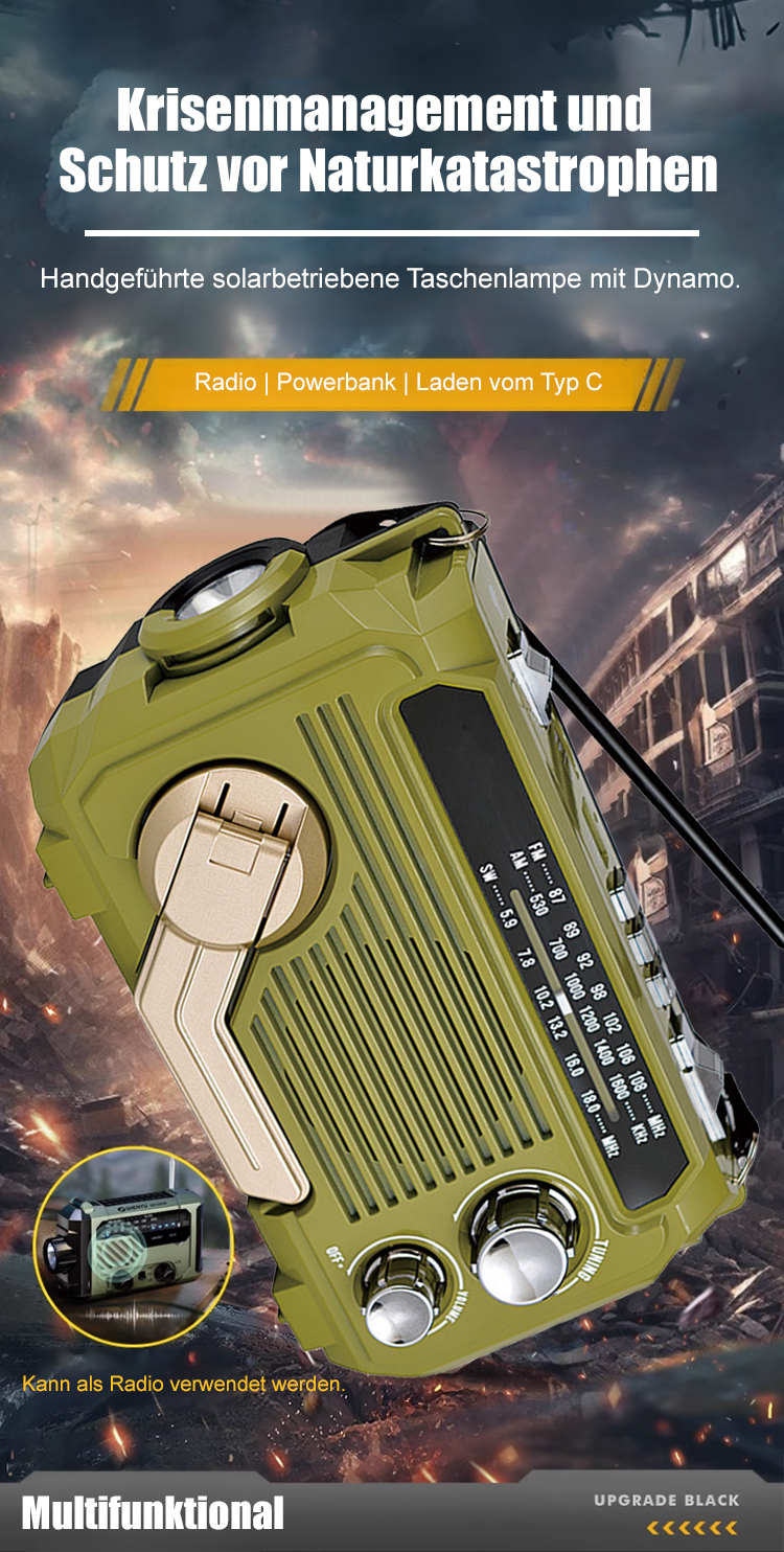 ✅️ Solaraufladung + Handkurbelgenerator + Alarm + Radio + Beleuchtung.